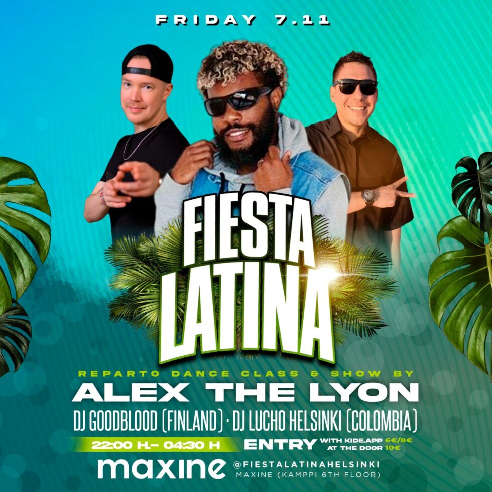 FIESTA LATINA on November 7 at Maxine!🔥 Join us for a very special night with guest Alex The Lyon🇨🇺 – bringing the fire with a Reparto dance class and a show you won’t forget! As always, DJ Goodblood🇫🇮 & DJ Lucho Helsinki🇨🇴with the best Latin hits! Welcome!🎉